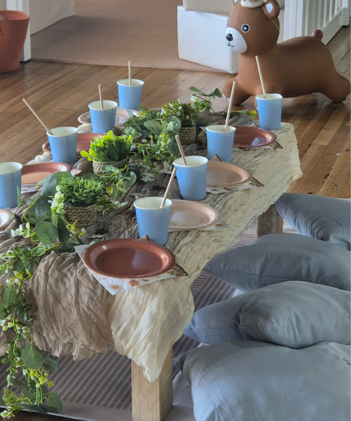 The diddy dining area includes the rustic low picnic table(s) , floor cushions and rugs, table runner, centrepieces, placemats, tableware and accessories.